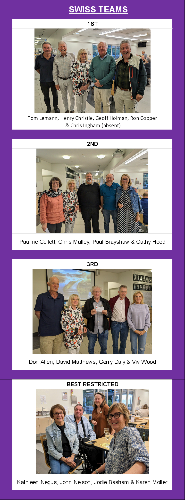 The afternoon saw the Farewell Pairs running alongside the second session of the Swiss Teams. Congratulations to the Restricted Team Winners for fronting up against quite a few of WA’s strongest players.